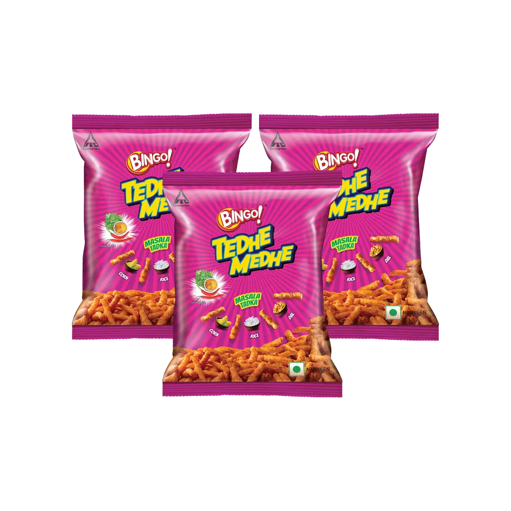 Pack containing 3 individual 75 g Bingo Tedhe Medhe packs